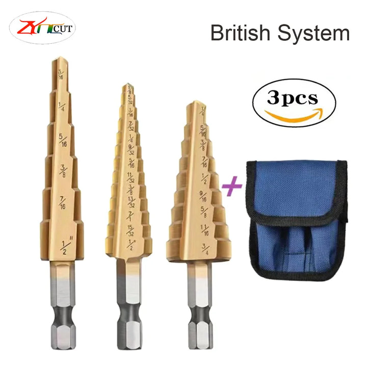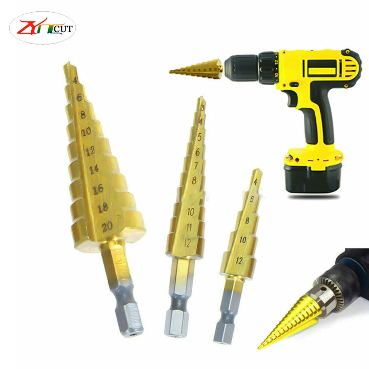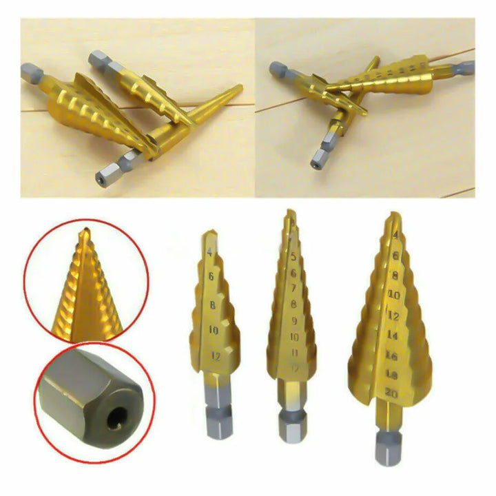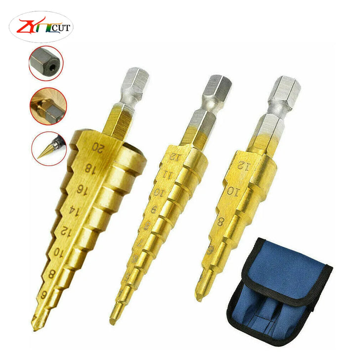 3Pcs set of 3-12mm 4-12mm 4-20mm Pagoda Drill Bits With Hexagonal Shank Straight Groove Ti Plated Stepped Drill Bits