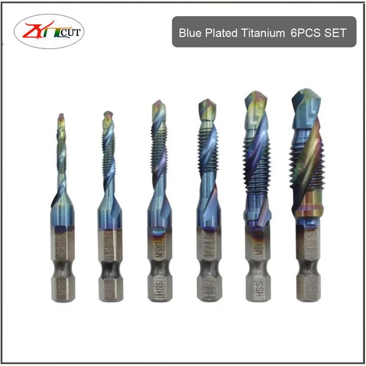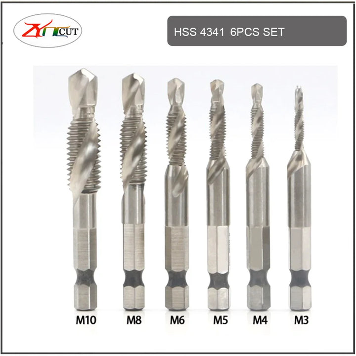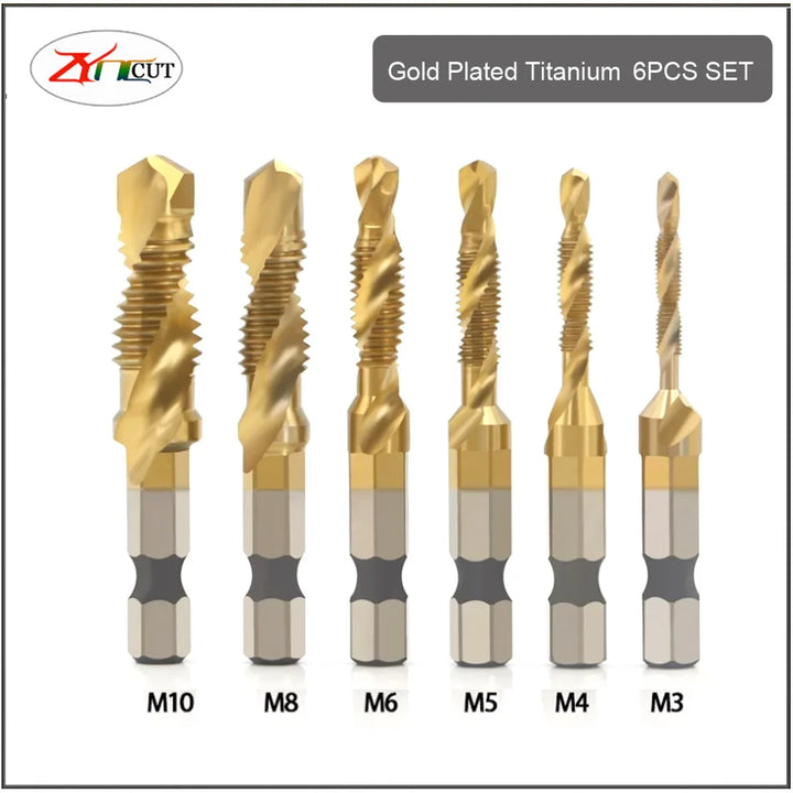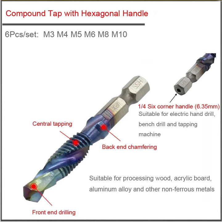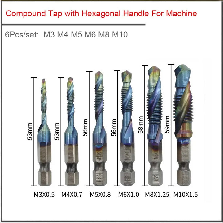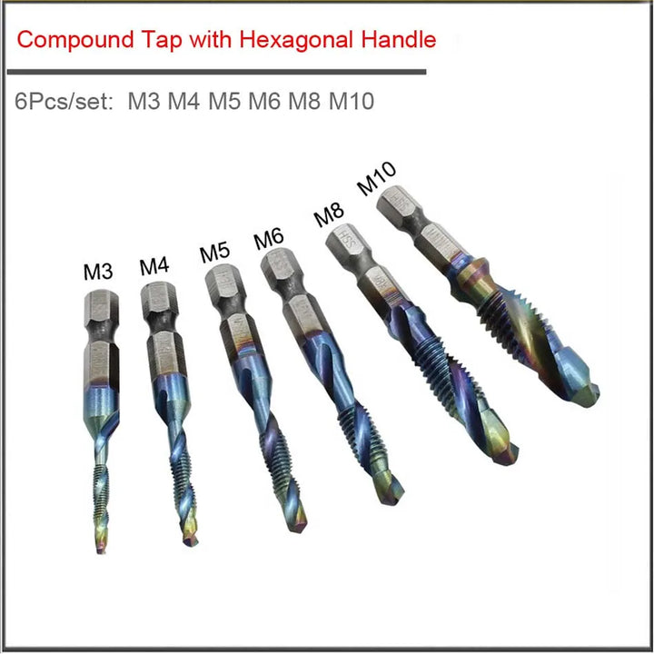 6Pcs M3 M4 M5 M6 M8 M10 Hand Tools Hex Shank Titanium Plated HSS Screw Thread Metric Tap Drill Bits Screw Machine Compound tap